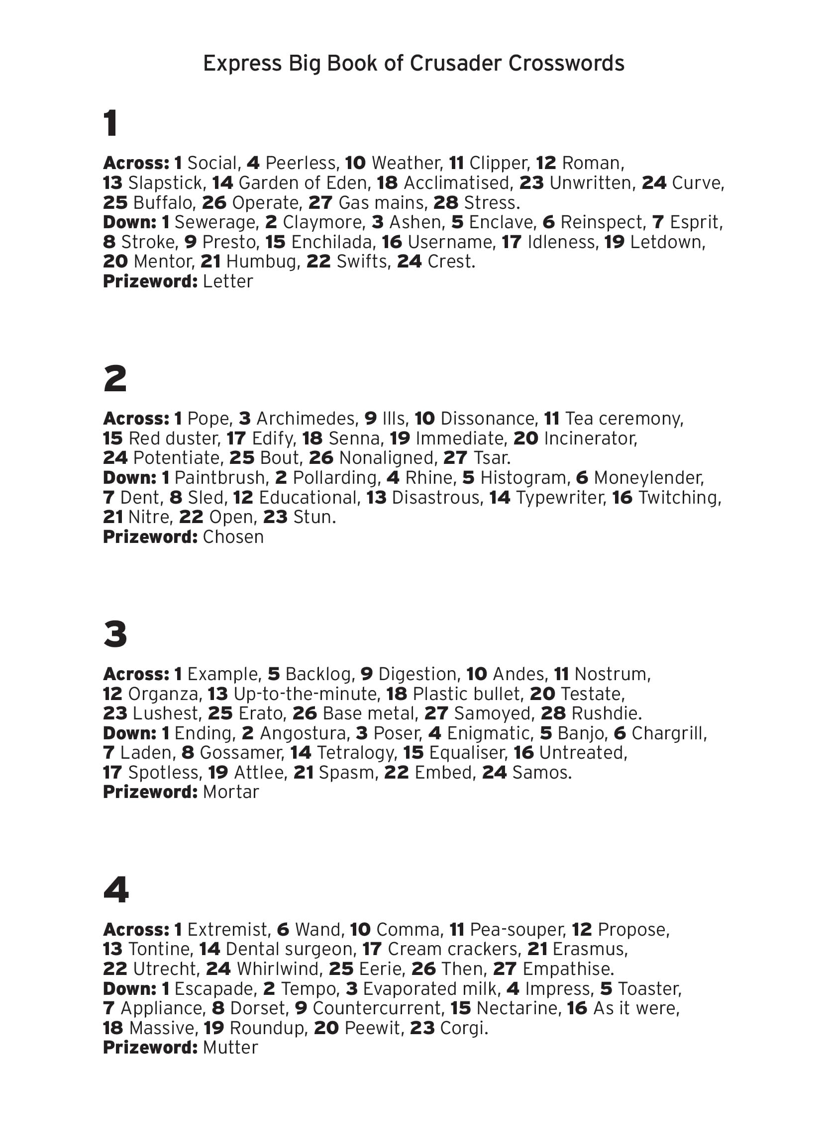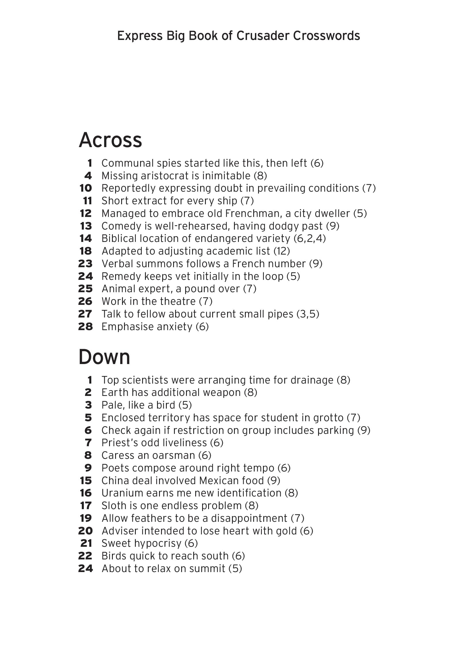 Details: The Daily Express's most popular puzzle returns! Test your wits against this brand-new compilation of 200 Crusader Crosswords, straight from the pages of the Daily Express. Taxing, absorbing and fun, this engaging edition will keep you entertained for hours. Whether you are a beginner or expert puzzler, this is the perfect puzzle book to have by your side.
